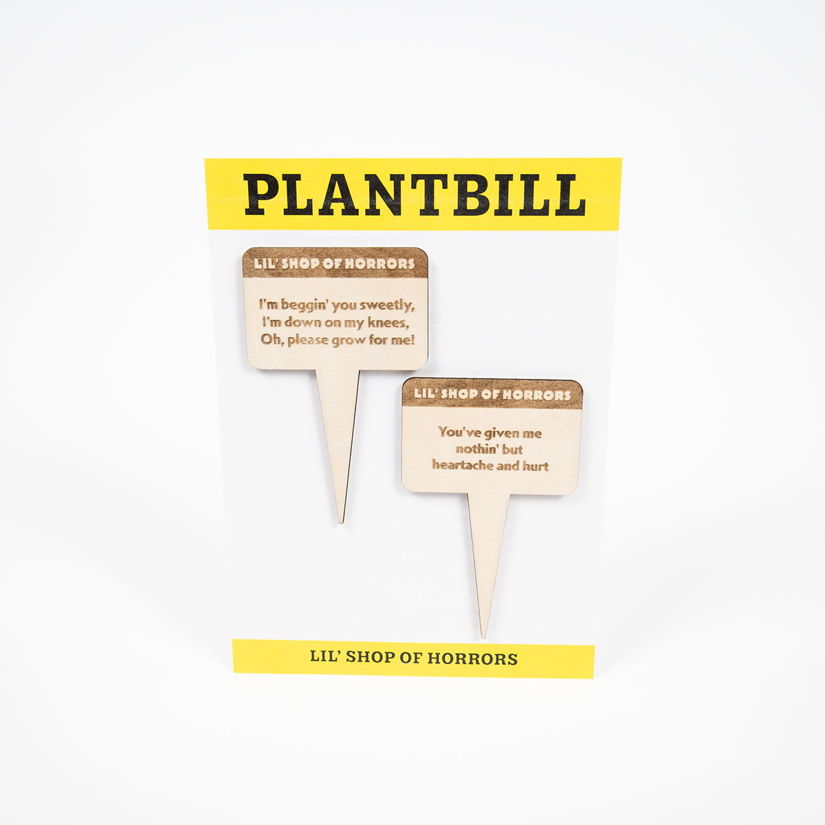 Show off your green thumb and love for Little Shop of Horrors with Plantbill! These plant stakes feature humorous lyrics that will make any plant parent smile. Perfect for adding a touch of quirkiness to your indoor or outdoor garden.