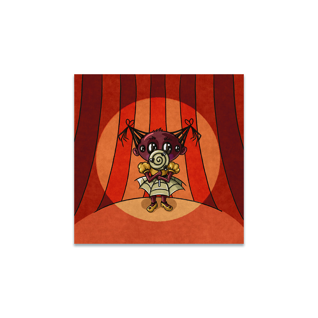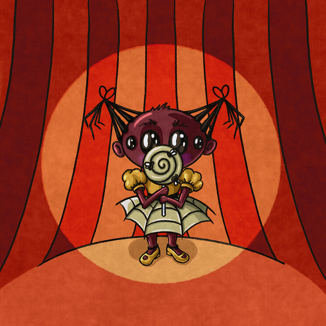 A halloween print of a cute little spider girl holding her sucker in the spotlight.