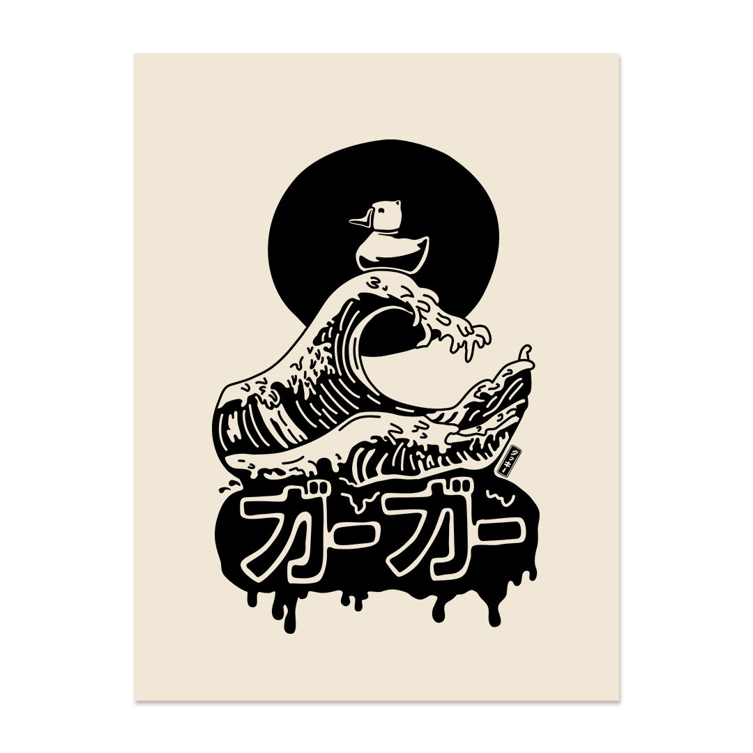 This 12x16 Ducky Riding a Wave Screen Print is a one-color print featuring a cute little ducky riding a wave in the setting sun.