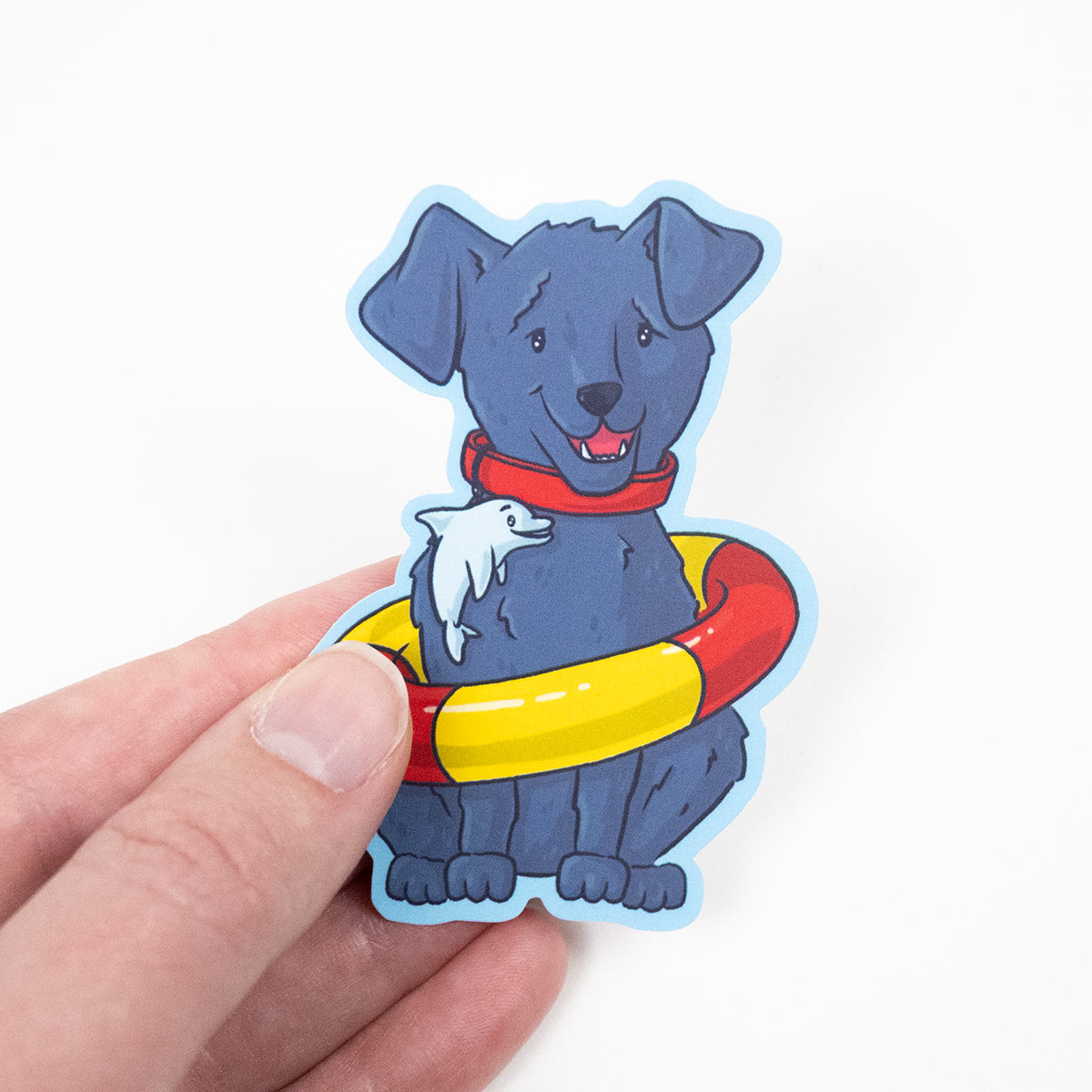 Share your love of the book, "Webbie and Dolphin Boy in the Great Pool Adventure" with a sticker of Webbie and his trusty sidekick, Dolphin Boy.